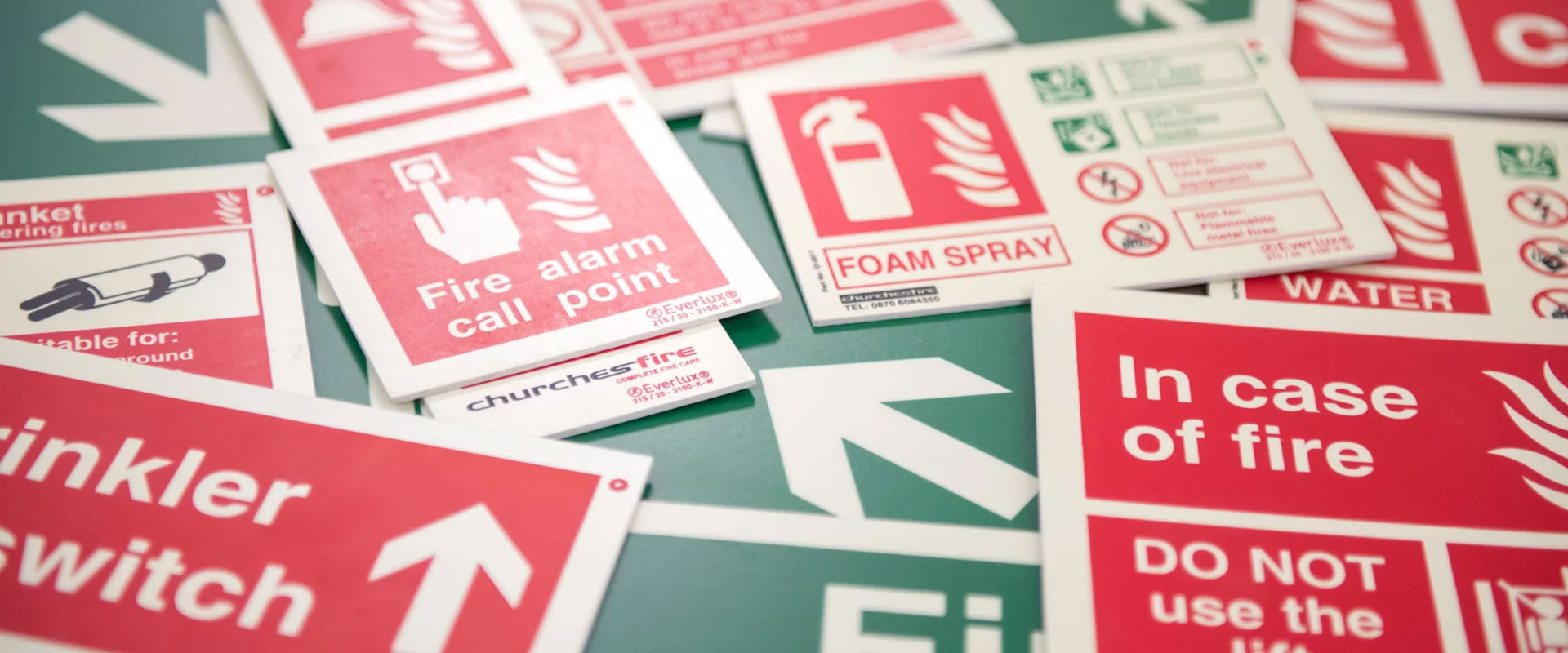 Posted near extinguishers explaining the PASS method (Pull, Aim, Squeeze, Sweep)